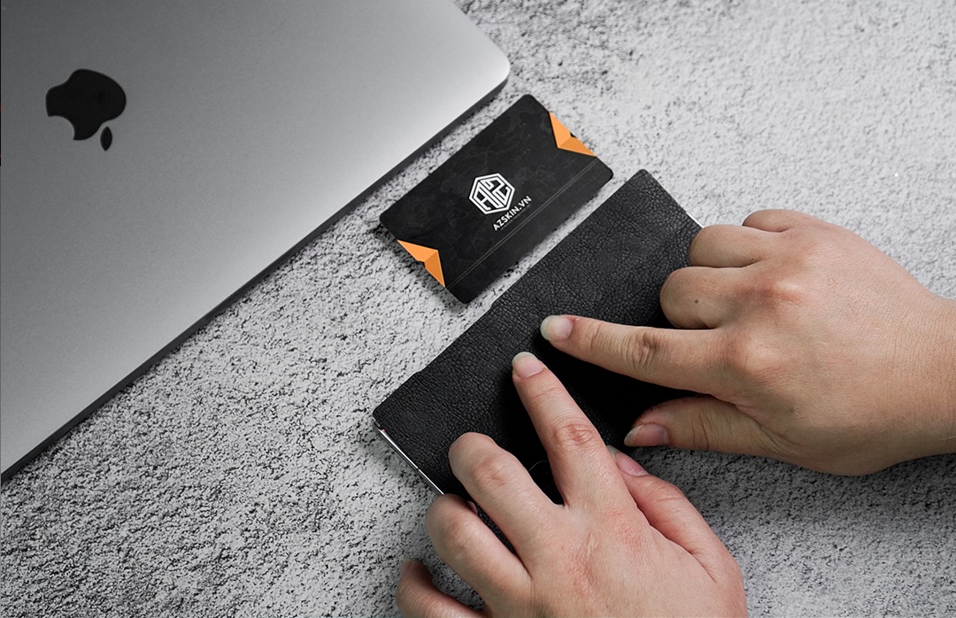 Bước 5: Dán và miết đều miếng dán da lên lưng máy cho đến khi dán ôm khít máy